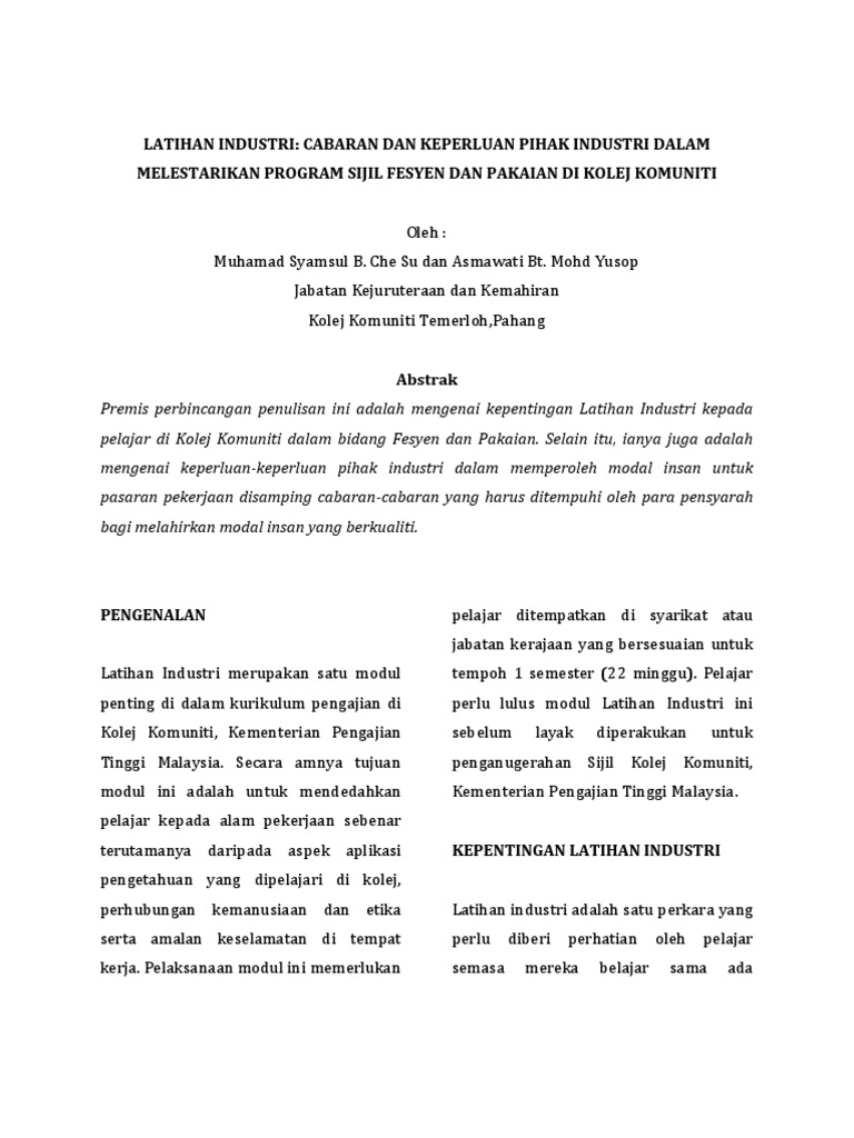 Latihan Industri Cabaran Dan Keperluan Pihak Industri Dalam Melestarikan Program Sijil Fesyen Dan Pakaian Di Kolej Komuniti Pdf